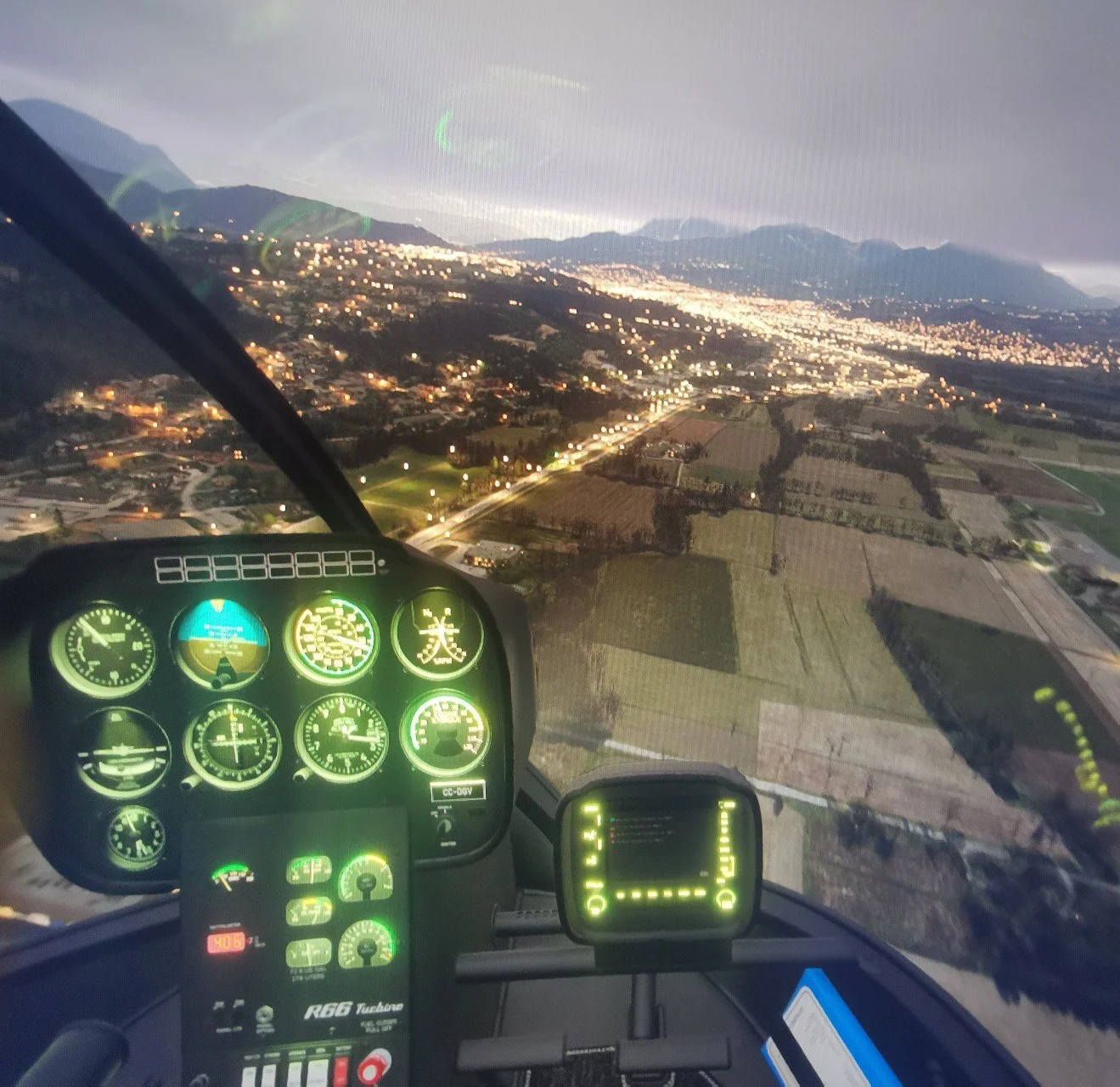 Dans la phase suivante, nous avons abordé le vol sans visibilité, ce qui m'a permis d’apprendre à voler dans des conditions de faible visibilité, par exemple en cas de brouillard ou de mauvaises conditions météorologiques. Cette phase m’a appris à me fier aux instruments de l'hélicoptère et à ma formation théorique pour gérer des situations où les repères visuels au sol sont limités.